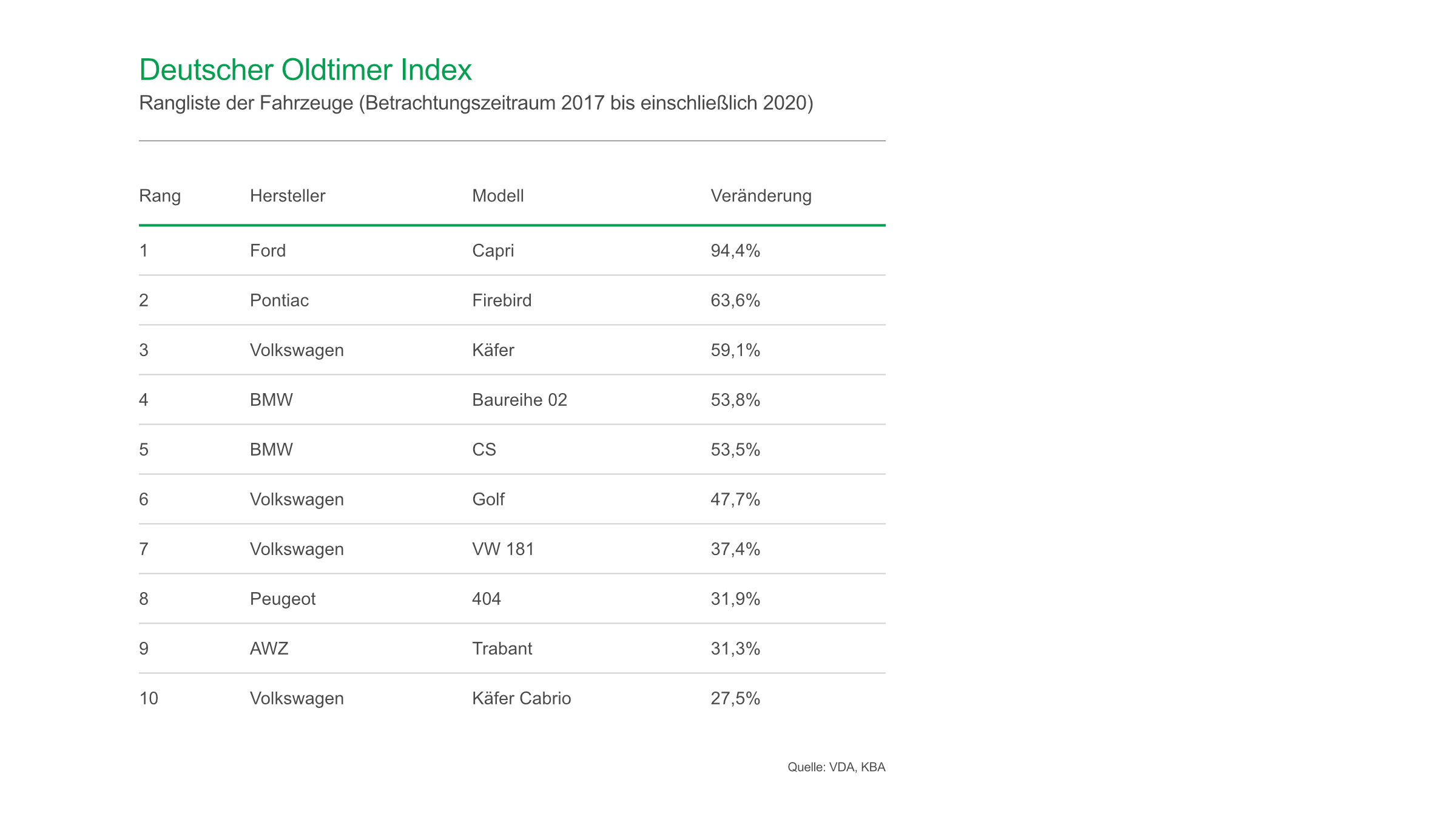 In der Top Ten der Wertzuwächse finden sich gleich acht Fahrzeuge deutscher Hersteller (Betrachtungszeitraum: 2017 bis einschließlich 2020). Dabei ist der Wert des Ford Capri I am deutlichsten gewachsen (plus 94,4 Prozent). Der VW Käfer ist gleich mit zwei Modellen aus verschiedenen Bauperioden in den Top Ten vertreten: Das Cabrio hat sich mit 27,5 Prozent zwar weniger stark, aber auf höherem Niveau entwickelt als das früher hergestellte Standardmodell, bei dem es einen Anstieg um 59,8 Prozent gab.